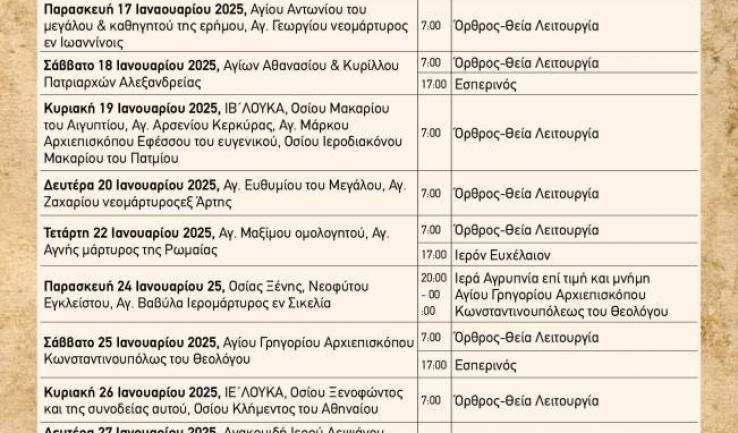 Πρόγραμμα ακολουθιών Ιανουαρίου 2025 Αγ. Τριάδος Πετρ.