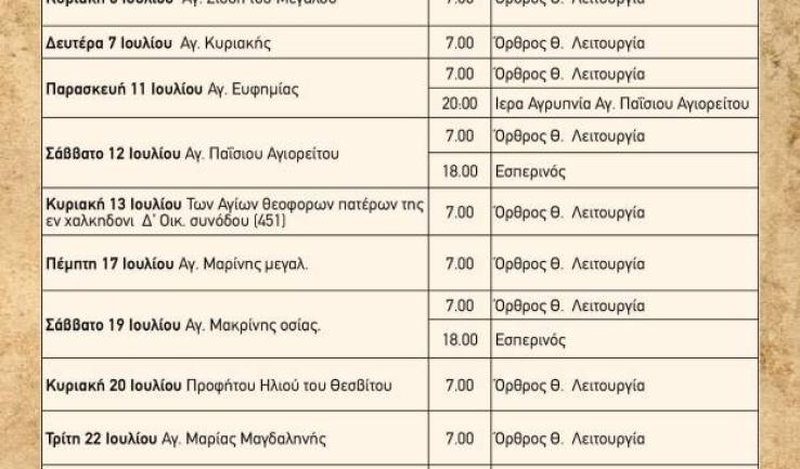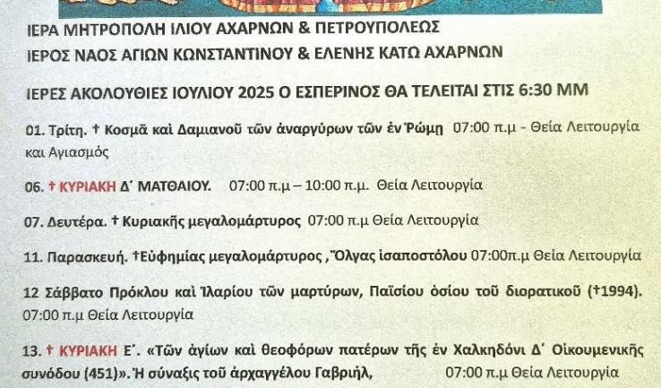 Πρόγραμμα ακολουθιών Ιουλίου 2025 ενορίας Αγ. Κων/νου Κ. Αχαρνών