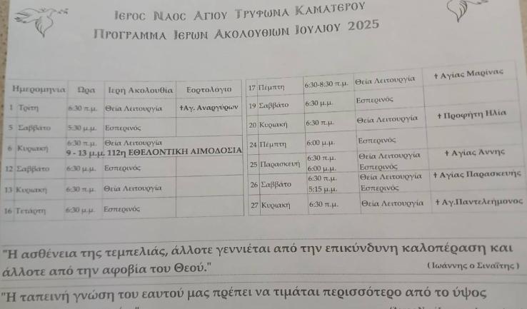 Πρόγραμμα ακολουθιών Ιουλίου 2025 ενορίας Αγ. Τρύφωνος Καματερού