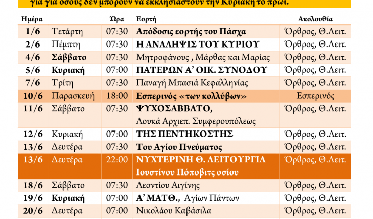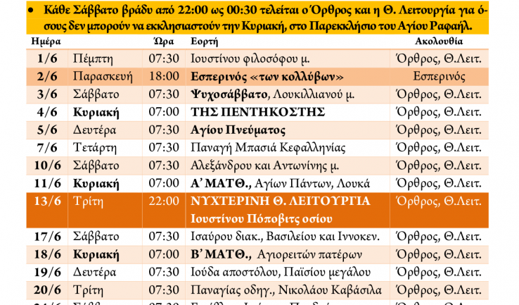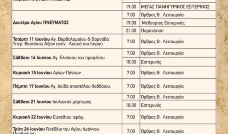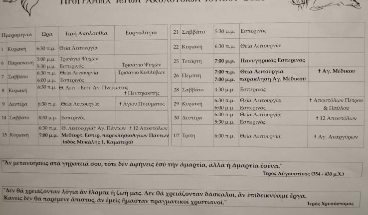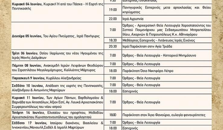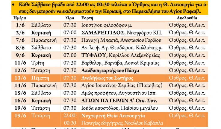 Πρόγραμμα ακολουθιών Ιουνίου 2023 ενορίας Αγ. Κωνσταντίνου Άνω Λιοσίων