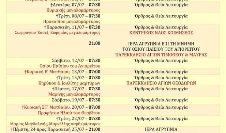 Πρόγραμμα ακολουθιών Ιουλίου 2025 ενορίας Κοιμήσεως Θεοτόκου Αχαρνών