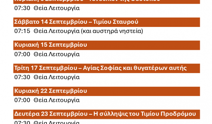 Πρόγραμμα ακολουθιών Σεπτεμβρίου 2025 ενορίας Αγ. Κων/νου Κ. Αχαρνών