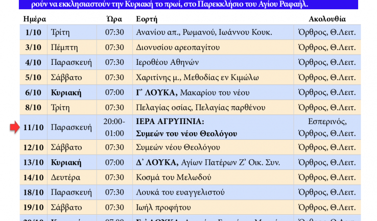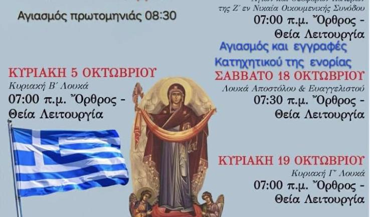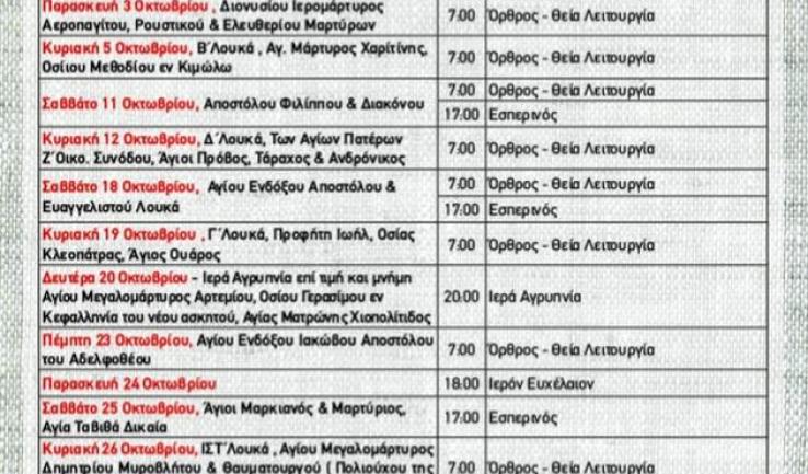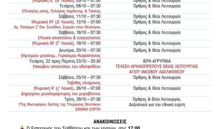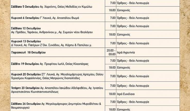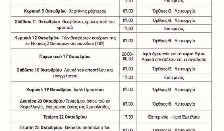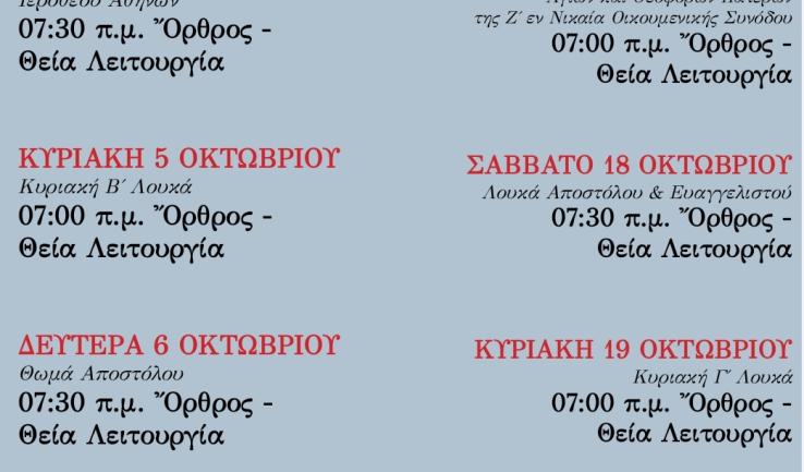 Πρόγραμμα ακολουθιών Οκτωβρίου 2024 ενορίας Αγίου Διονυσίου Αχαρνών