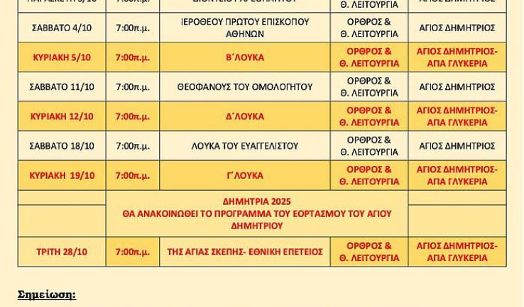 Πρόγραμμα ακολουθιών Οκτωβρίου 2025 Αγ. Δημητρίου Πετρ.