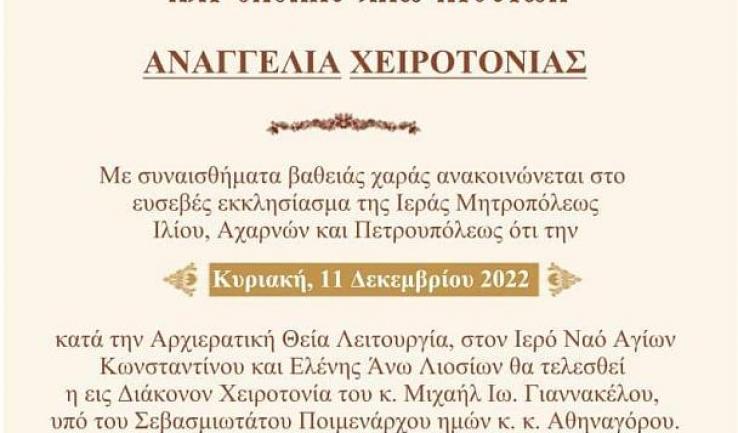 Αναγγελία χειροτονίας στα Άνω Λιόσια