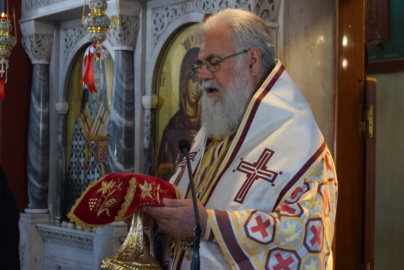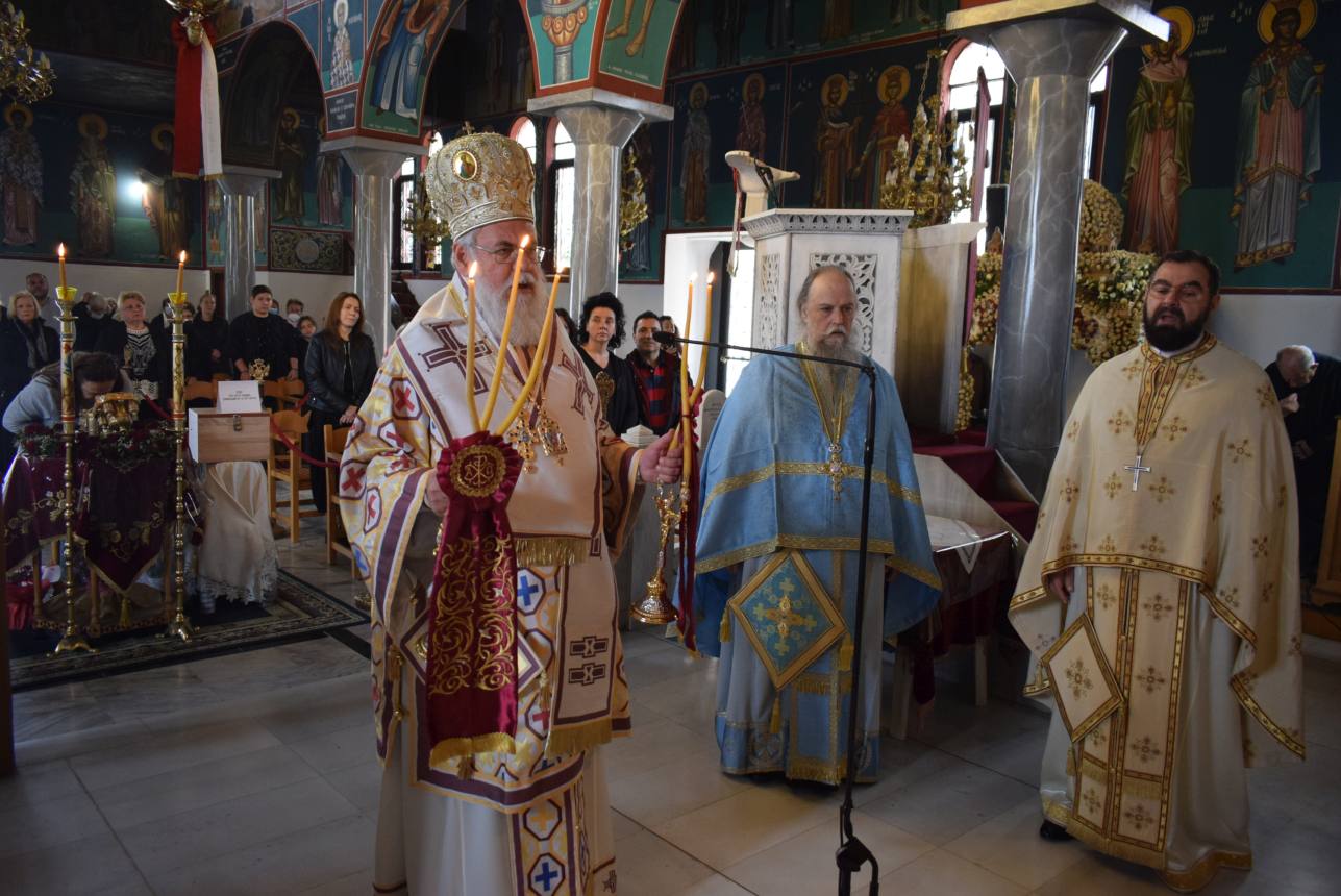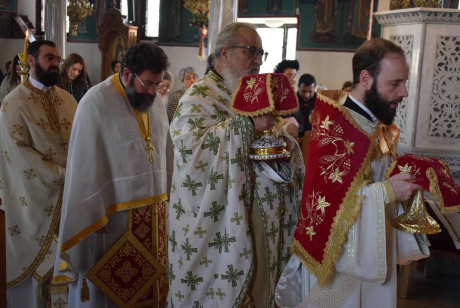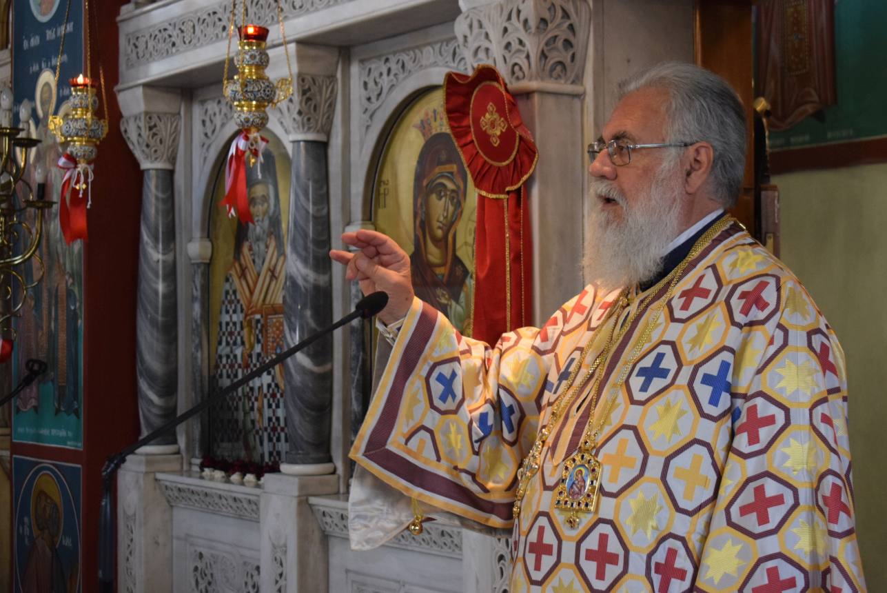 Πριν το τέλος της Θείας Λειτουργίας και αφού τελέστηκε η ακολουθία της αρτοκλασίας και η ευλογία των κολύβων του Αγίου, ο Σεβασμιώτατος αναφέρθηκε στον στίχο του απολυτικίου της Μεσοπεντηκοστής «Μεσούσης τῆς ἑορτῆς, διψῶσάν μου τὴν ψυχήν, εὐσεβείας πότισον νάματα», τονίζοντας ότι τα νάματα που αναφέρονται δεν είναι μόνο τα σωτήρια λόγια του Χριστού και του Ευαγγελίου Του, αλλά και η βίωσή τους μέσω της Θείας Ευχαριστίας, που τροφοδοτεί τον άνθρωπο και τον οδηγεί στη σωτηρία του. Ο Άγιος Γεώργιος, του οποίου τα λείψανα προσκυνούμε, είναι ζωντανή έκφραση αυτής της πραγματικότητας, αφού την επιβεβαίωσε με το μαρτύριό του.