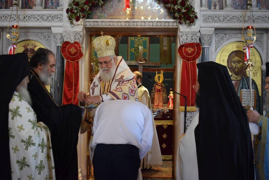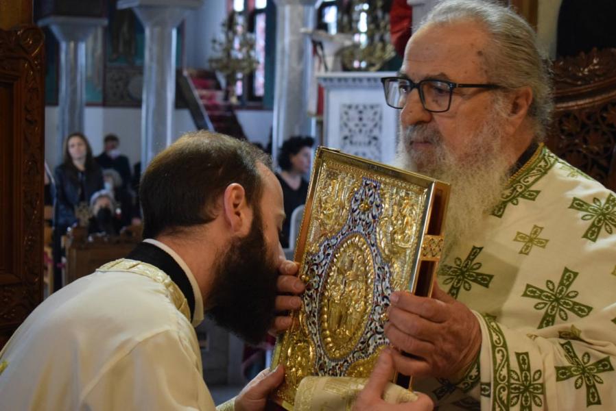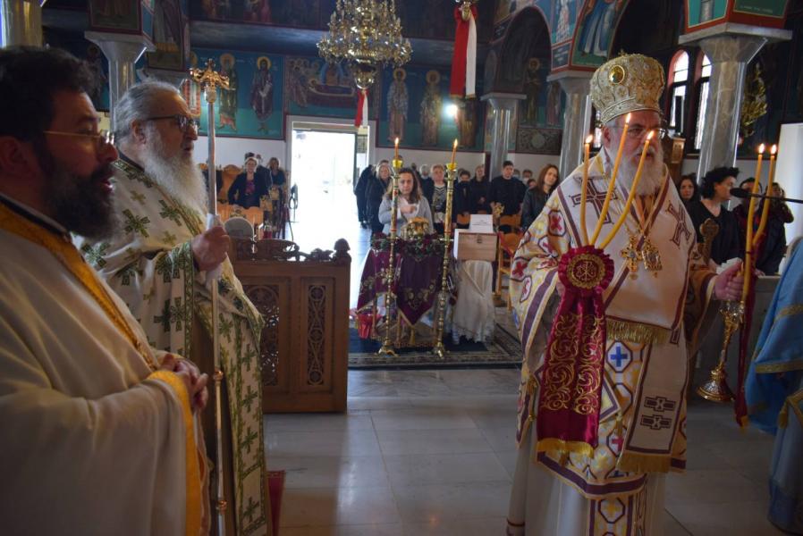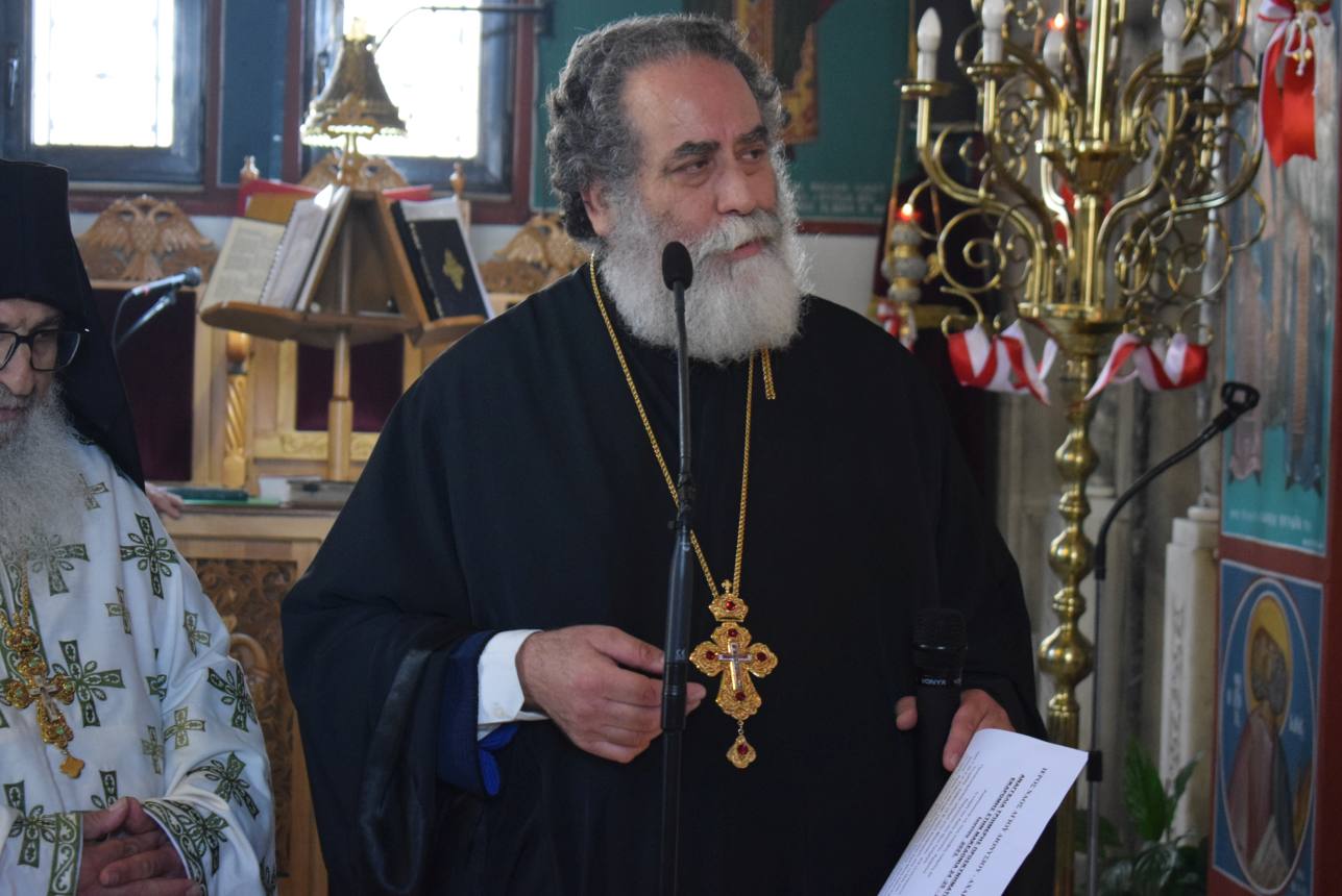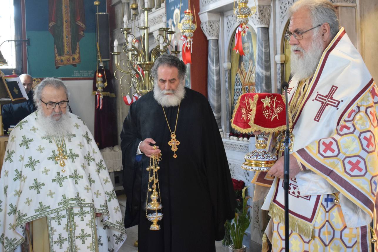 Πριν το τέλος της Θείας Λειτουργίας και αφού τελέστηκε η ακολουθία της αρτοκλασίας και η ευλογία των κολύβων του Αγίου, ο Σεβασμιώτατος αναφέρθηκε στον στίχο του απολυτικίου της Μεσοπεντηκοστής «Μεσούσης τῆς ἑορτῆς, διψῶσάν μου τὴν ψυχήν, εὐσεβείας πότισον νάματα», τονίζοντας ότι τα νάματα που αναφέρονται δεν είναι μόνο τα σωτήρια λόγια του Χριστού και του Ευαγγελίου Του, αλλά και η βίωσή τους μέσω της Θείας Ευχαριστίας, που τροφοδοτεί τον άνθρωπο και τον οδηγεί στη σωτηρία του. Ο Άγιος Γεώργιος, του οποίου τα λείψανα προσκυνούμε, είναι ζωντανή έκφραση αυτής της πραγματικότητας, αφού την επιβεβαίωσε με το μαρτύριό του.