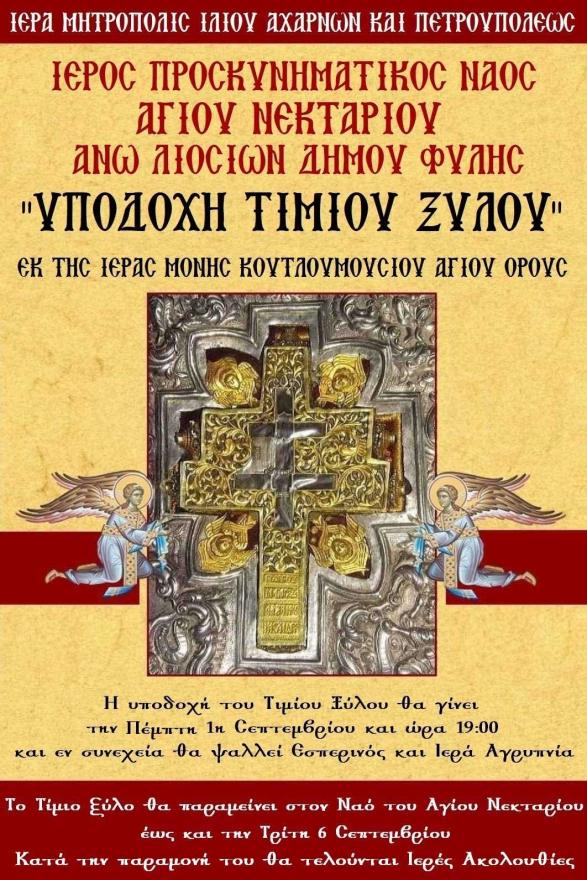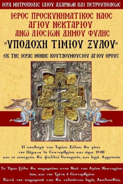 Από την Ιερά Μονή Κουτλουμουσίου Αγίου Όρους θα μεταφερθεί και θα τεθεί προς προσκύνηση τεμάχιο Τιμίου Ξύλου στον Ιερό Προσκυνηματικό Ναό Αγίου Νεκταρίου Άνω Λιοσίων.